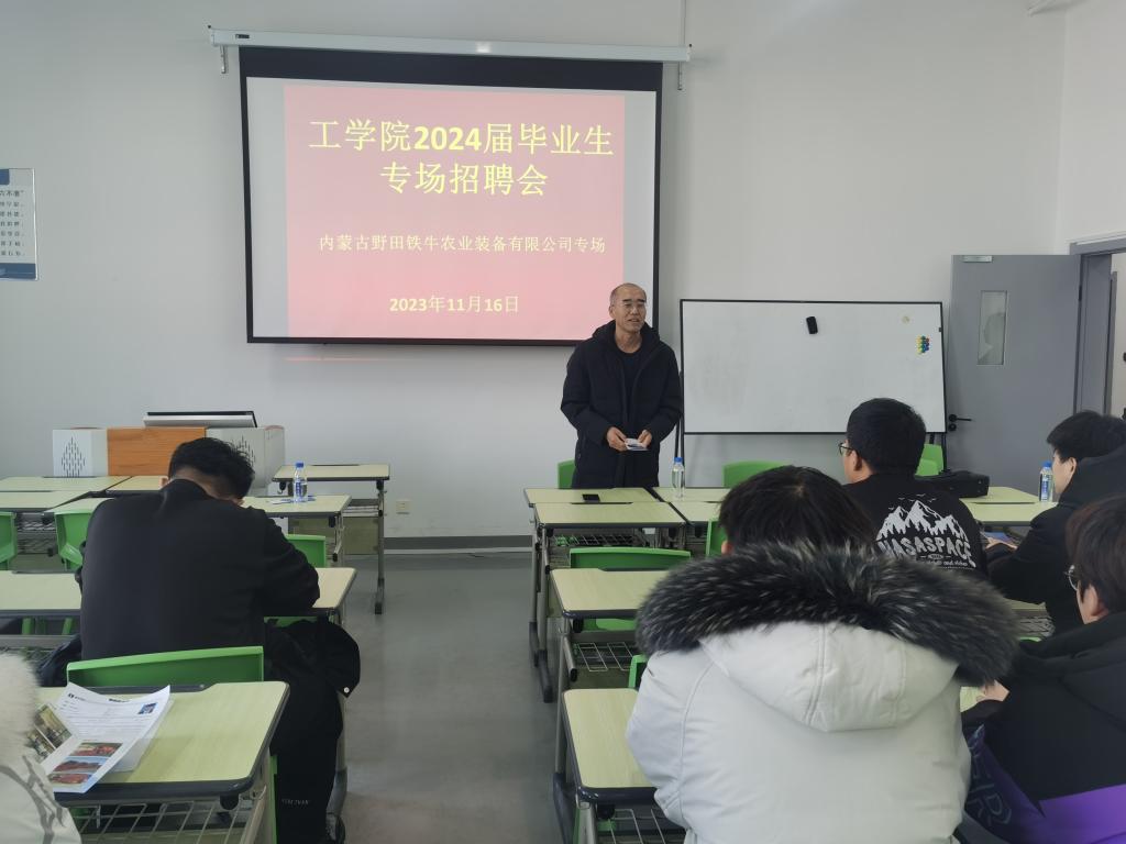 为进一步做好2024届毕业生就业工作,11月16日下午,工学院邀请内蒙古野田铁牛农业装备有限公司在东山实训楼C521教室举办专场招聘宣讲会。会议由学院党总支副书记吴晗主持,2024届毕业生30余人参加了此次招聘会。
