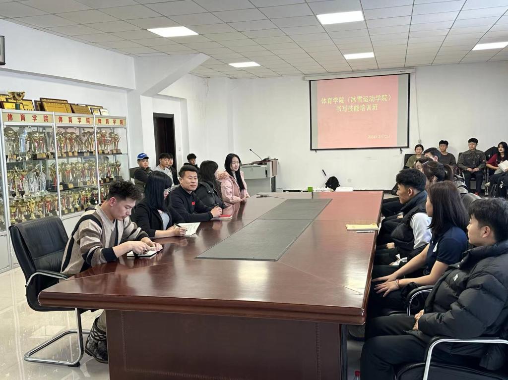 为了提高师范生书写技能,3月12日下午,体育学院(冰雪运动学院)特邀美术学院的师生在东山田径场二楼会议室为学院2023级学生进行书写技能培训。学院党总支副书记凌占一、团学办副主任张娜娜、2023级辅导员学峰以及2023级全体学生共同参加本次活动。