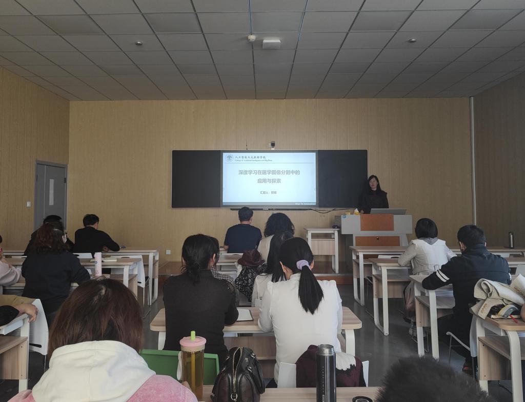 为提高人工智能与大数据学院教师的学术素养和水平,4月17日下午,人工智能与大数据学院在行知楼C523智慧教室开展了题为《深度学习在医学图像的分割中的应用与探索》的学术讲座。本次讲座由学院院长刘仁山主持,学院教师塔娜博士主讲,全体教师参加。