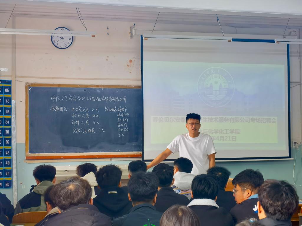为了给2024届毕业生提供更广阔的就业平台,进一步拓宽就业渠道,矿业与化学化工学院邀请呼伦贝尔市安泰职业卫生技术服务有限公司和内蒙古宜化化工有限公司于4月21日上午在工程楼415教室联合召开了专场招聘会。学院党总支副书记敖岩辉,辅导员孟庆永、庞明慧及2024届在校毕业生参会。