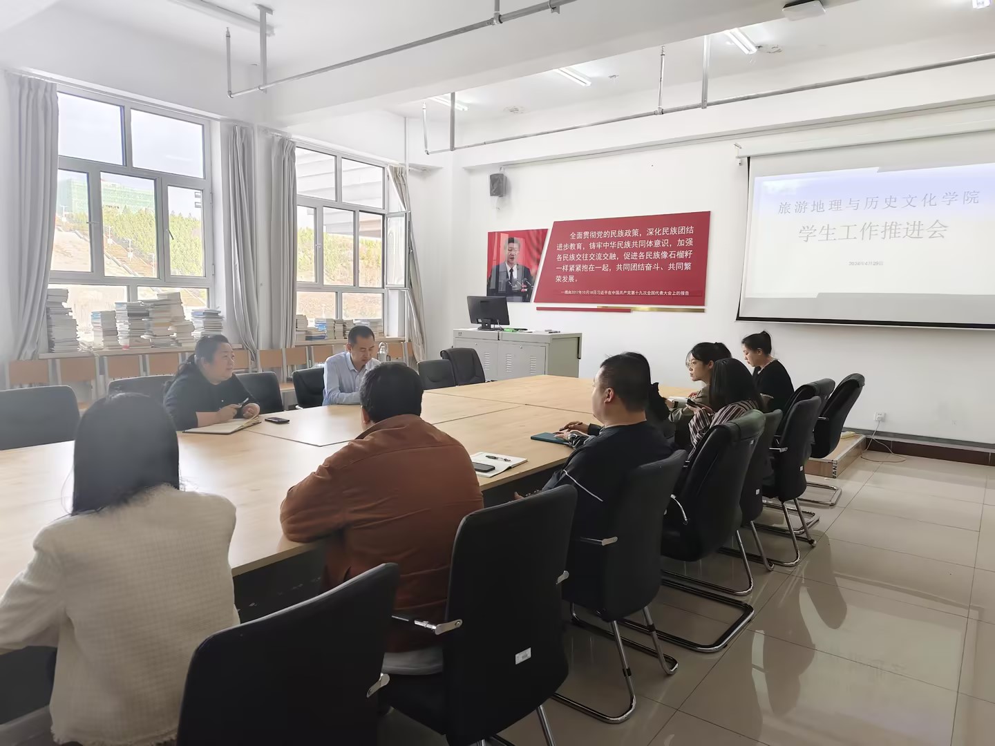 4月29日,旅游地理与历史文化学院于崇文楼B307会议室开展五一假期学生工作会议,学院党总支书记赵金辉、副书记王宏霞、团学办主任张程喧及各年级辅导员参会。