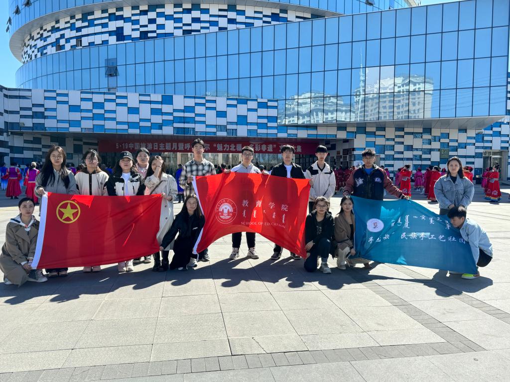 三是开展“庆五一”研学活动。教育学院学生党支部携手教之翼·巧手艺族手工艺社团在呼伦贝尔市文化馆开展“魅力北疆,多彩非遗:五一劳动节文创大集观光研学活动”,同学们欣赏到鄂温克叠绣、太阳花、传统皮雕、马头琴制作技艺、蒙兀文创、搓毛绳等各种精美的非遗手工艺品,每一件作品都凝聚了非遗传承人的心血和智慧,感受到了非遗传承人精湛的技艺及非遗文化的独特魅力。