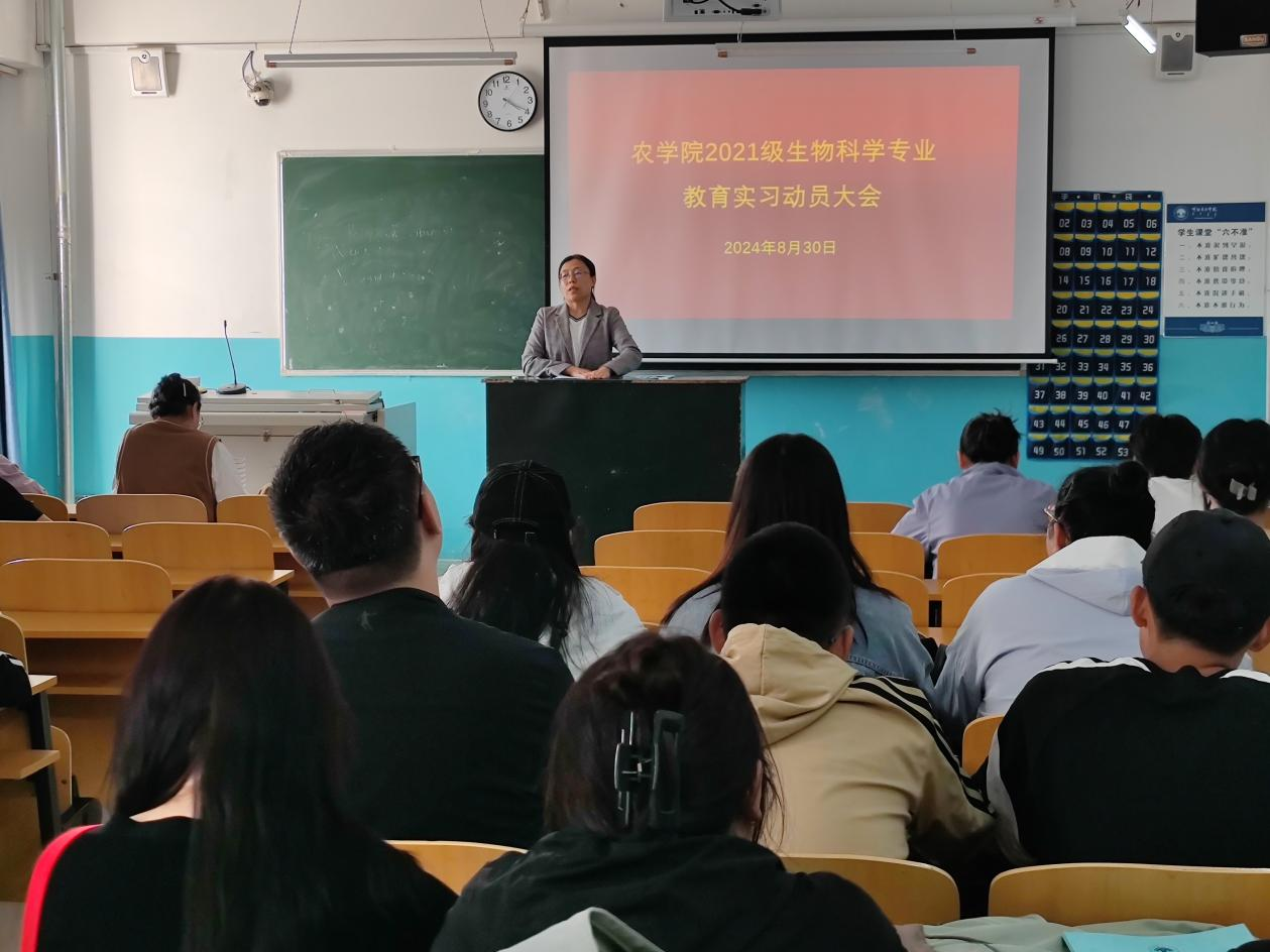 为保证2021级生物科学专业学生教育实习的顺利开展,农学院于8月30日在艺术楼201教室召开2021级生物科学专业实习动员大会。学院副院长肖燕子、专业负责人胡日查、实习领队教师胡达古拉、教师代表于若男及2021级生物科学专业全体学生参加会议。