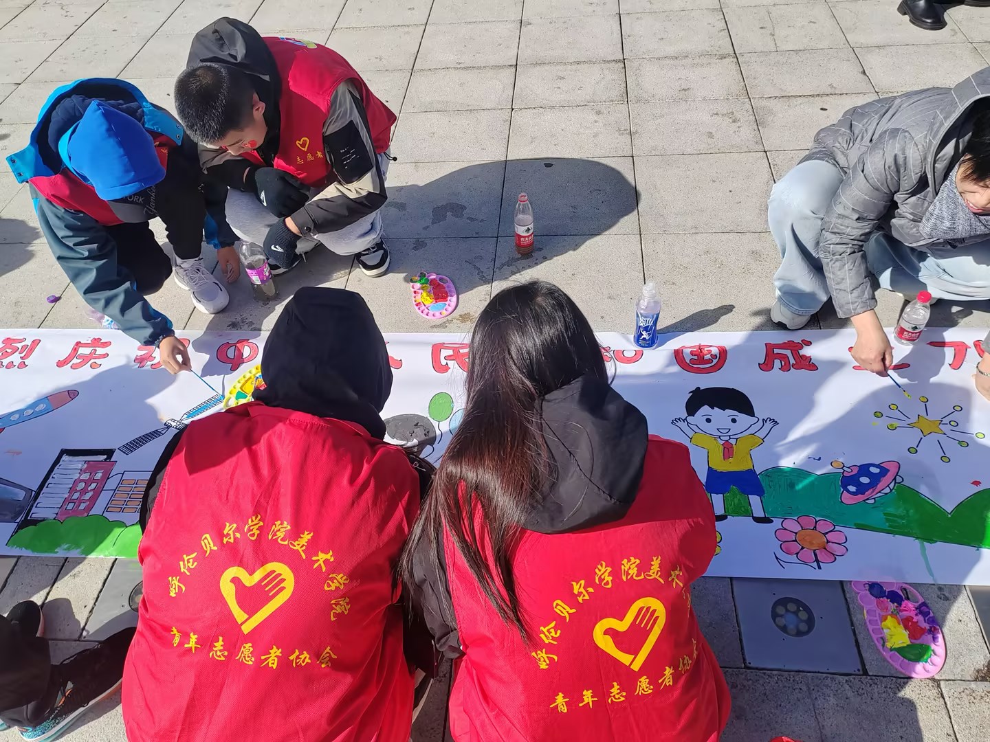 为庆祝中华人民共和国成立75周年,进一步弘扬爱国主义精神,传承红色基因,激发群众爱国情怀,10月1日上午,美术学院组织了一支充满热情的志愿者队伍,携手呼伦贝尔青年志愿者协会,在成吉思汗广场成功开展了以“亲子同心筑梦,共绘祖国美景”为主题的关爱儿童美育支教活动。