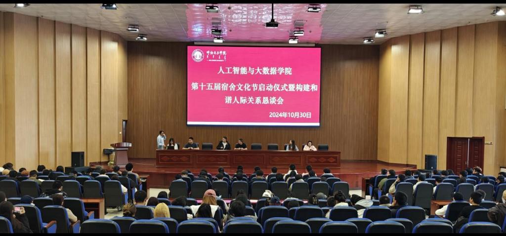 10月30日下午,人工智能与大数据学院第十五届大学生宿舍文化节启动大会暨构建和谐人际关系恳谈会于图书馆四层报告厅成功举行。学院党总支书记朱福生、学工办主任肖慧英、团总支书记刘宏亮以及各年级辅导员和各班班委、宿舍长参加了会议。