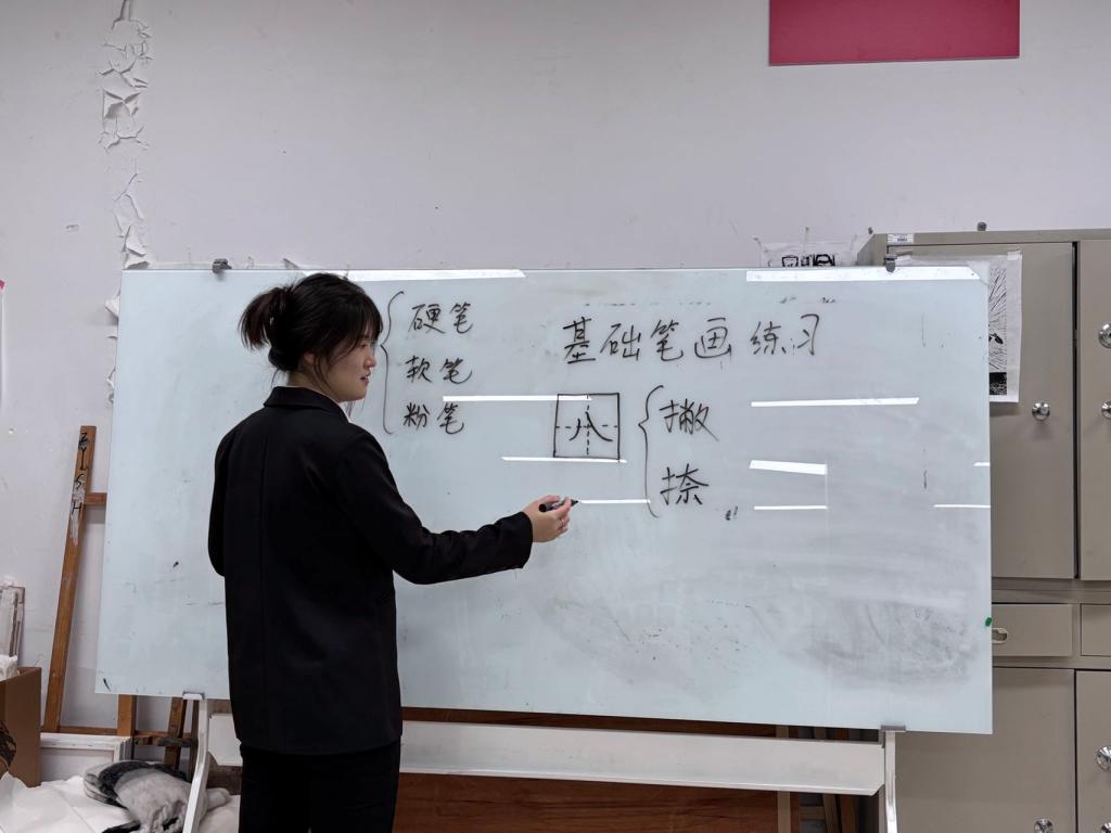 活动中,品轩书法社团为师范生们量身定制了三笔字技能训练计划,并聘请了2022级书法学专业的优秀学生作为助教,利用每一个晚自习,为师范生提供了专业的书法系列培训。培训内容涵盖了毛笔字、钢笔字和粉笔字三种书写形式,每种书写形式都有其独特的教学重点。通过助教的悉心指导,同学们从生疏到熟练,从迷茫到热爱。