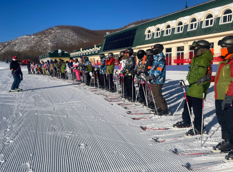 在雪道上,同学们已身着鲜艳的滑雪服,脚蹬雪板,手持雪杖,满怀激情地齐聚滑雪场。他们身姿矫健,眼神中透露出对即将开始的滑雪课程的期待与渴望。这些年轻的学子们,来自不同的专业和年级,因滑雪课而汇聚于此,共同踏上冰雪运动的征程。
