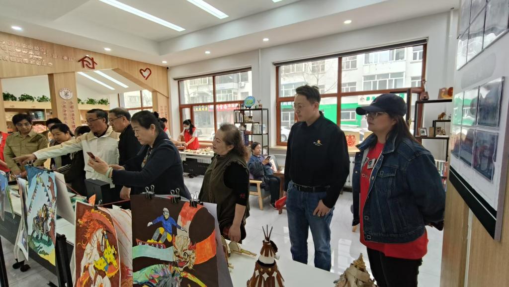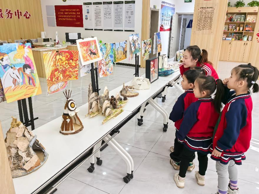 美术学院师生以“北疆文化”展示区为载体,构建起沉浸式美育空间。活动通过海报、展板等视觉媒介,以信息为载体,成为传播民族团结理念的“美育微课堂”。蒙古族马鞍、马鞭等传统器具作为物质文化符号,经艺术化陈列与情境化叙事,实现从“静态展品”到“文化读本”的转化。图文展通过数字绘画、平面设计等艺术形式,将蒙古马精神、“三北精神”进行视觉化转译,使抽象的精神内核具象为可感知、可传播的文化图像。学生志愿者认真讲解展品背后的民族文化基因,引导居民在审美体验中感受各民族文化的共生关系,实现“以美启真”的认知提升。