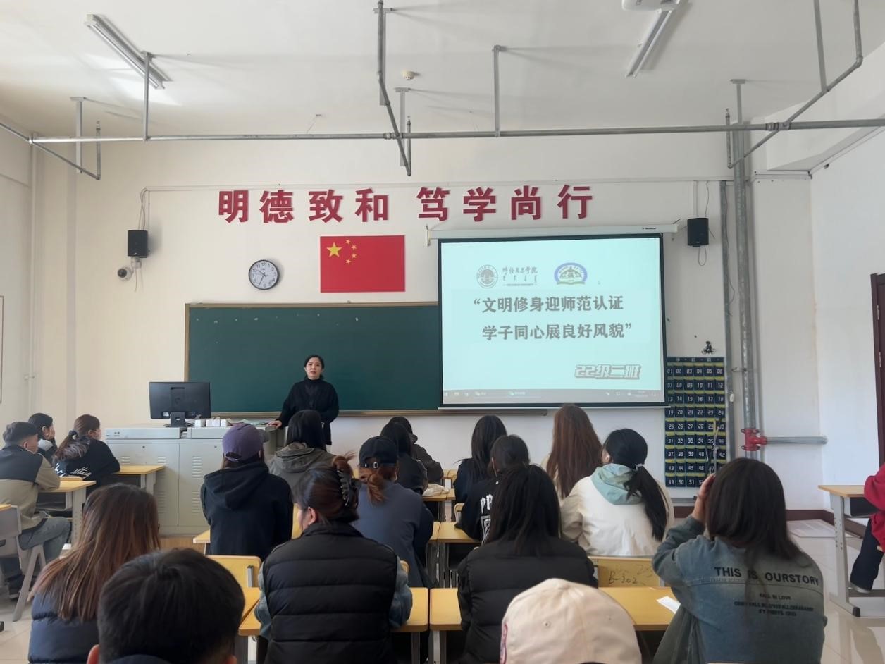 为迎接第五批师范类专业认证专家入校考查,5月14日至16日,蒙古学学院组织各班开展“文明修身迎师范认证,学子同心展良好风貌”主题班会,聚焦文明修身教育,引导全院学生以规范言行与优良风貌助力学校师范类专业认证工作。