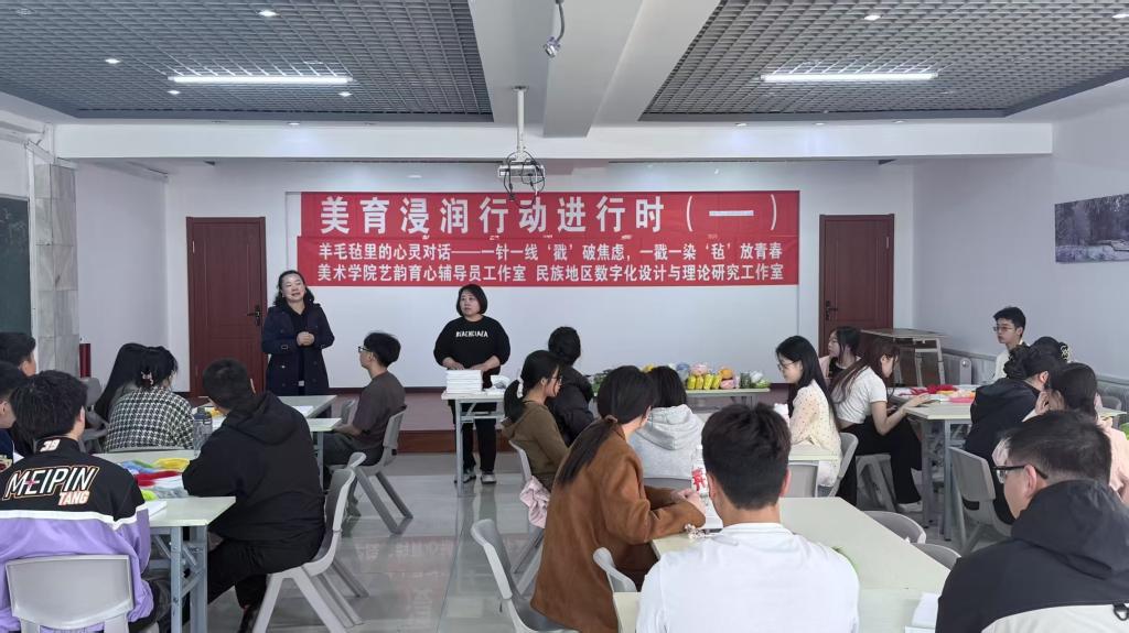 一针一线,戳破焦虑阴霾;一戳一染,“毡”放青春色彩。5月17日,美术学院主办的“美育浸润心灵——羊毛毡里的心灵对话”主题活动圆满结束。来自各学院的40余名同学相聚一堂,在美术学院环境设计专业教师赵雪莲的指导下,以非遗羊毛毡为媒介,开启了一场融合心理健康与美育教育的治愈之旅。