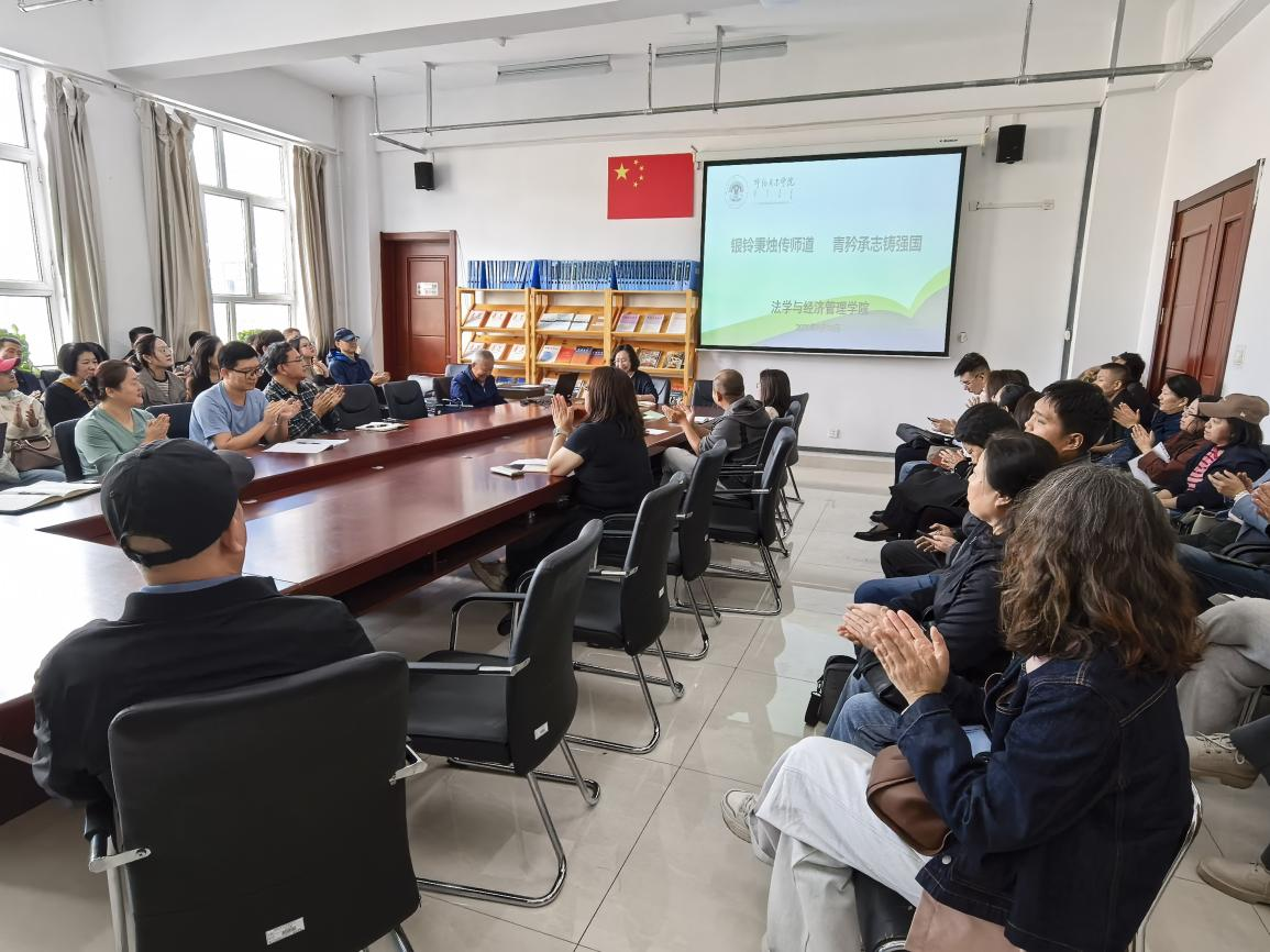 为庆祝第41个教师节,更好激励教师能够以教育家精神铸魂强师,谱写教育强国建设华章,9月10日下午,法学与经济管理学院党总支开展“银龄秉烛传师道,青衿承志铸强国”主题党日,邀请学校退休教师包玉山围绕“传承北疆文化,弘扬教育家精神,回顾戍边教师奋进历程”主题作专题讲座,学院全体教职工参加学习。