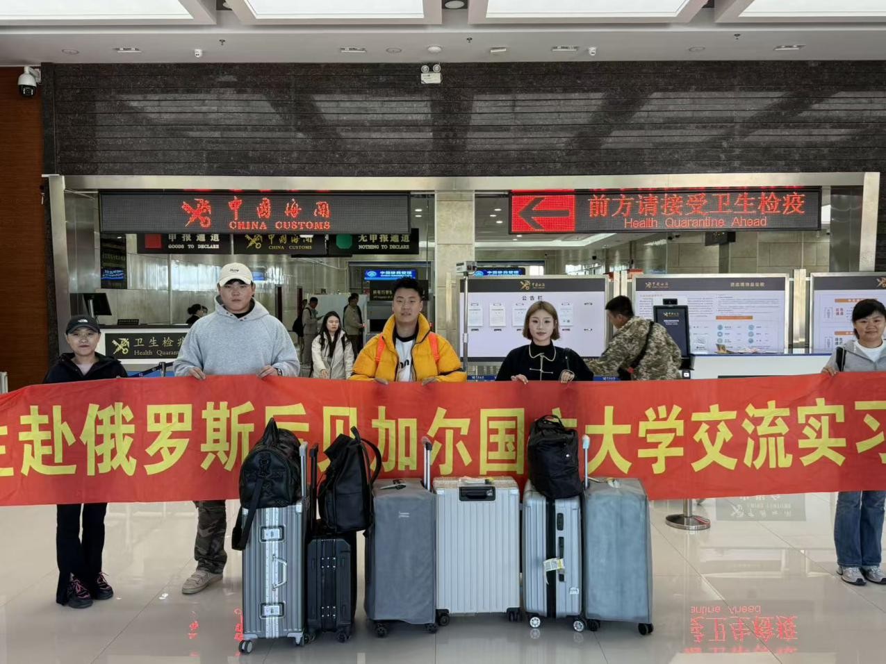 9月17日上午,外国语学院派俄语系主任李婧和副主任王岩作为代表前往机场,为即将赴俄罗斯后贝加尔国立大学攻读硕士学位和进行一学期交流学习的学生举行送别仪式。送别现场,两位老师将安全叮嘱与学业期许融入临别祝福,为学生的跨国求学之旅注入温暖力量。