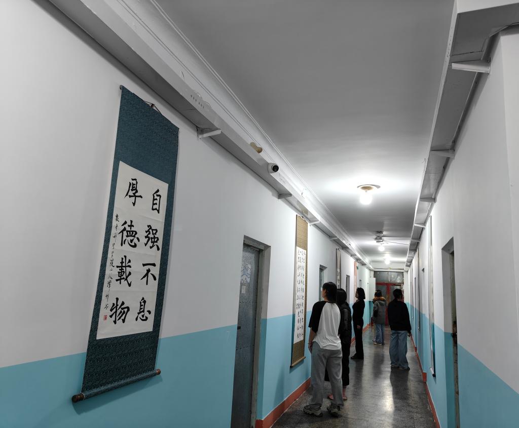 走进6号宿舍楼,原本静谧朴素的楼道焕发出崭新的生机与活力。一幅幅主题鲜明、形式多样的艺术作品错落有致地陈列于墙面,或笔走龙蛇的书法作品刚劲有力,或色彩明丽的绘画作品意境深远。这些作品均出自美术学院师生之手,既有对红色经典的深情致敬,也有对时代精神的创新表达,字里行间皆是信仰的回响,笔墨丹青之中尽显初心的力量。