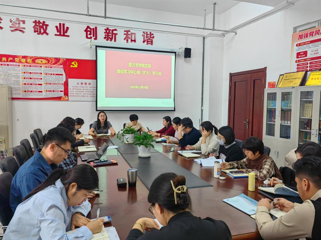 为深入领会党的二十届四中全会精神内涵,将其转化为推动学院各项事业蓬勃发展的强大动力,11月19日下午,蒙古学学院党委组织开展了党的二十届四中全会精神专题学习会。会议由学院党委书记格根塔娜主持,学院全体教职工参加。