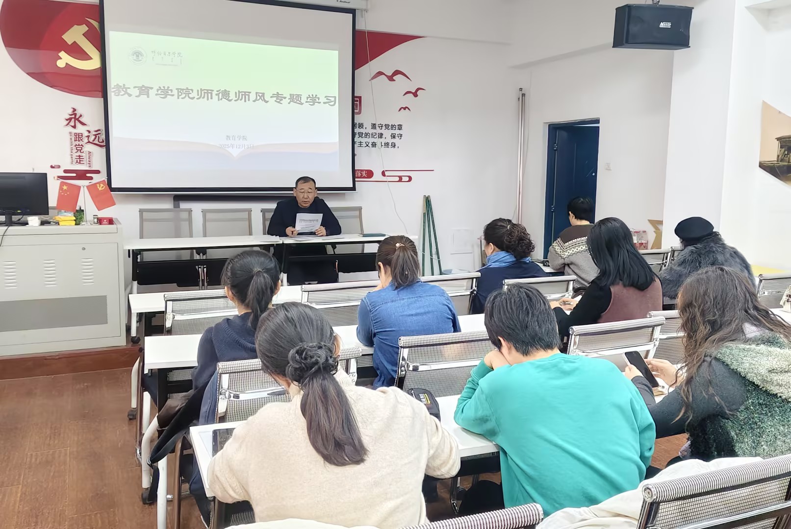 为进一步强化教师队伍纪律规矩意识,筑牢教书育人思想根基,12月3日下午,教育学院组织召开了师德师风专题学习暨警示教育会议。学院全体教职工参加会议,会议由学院党委书记海江主持。