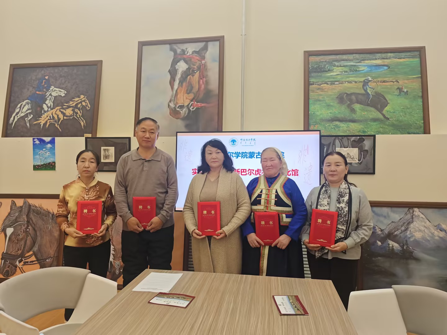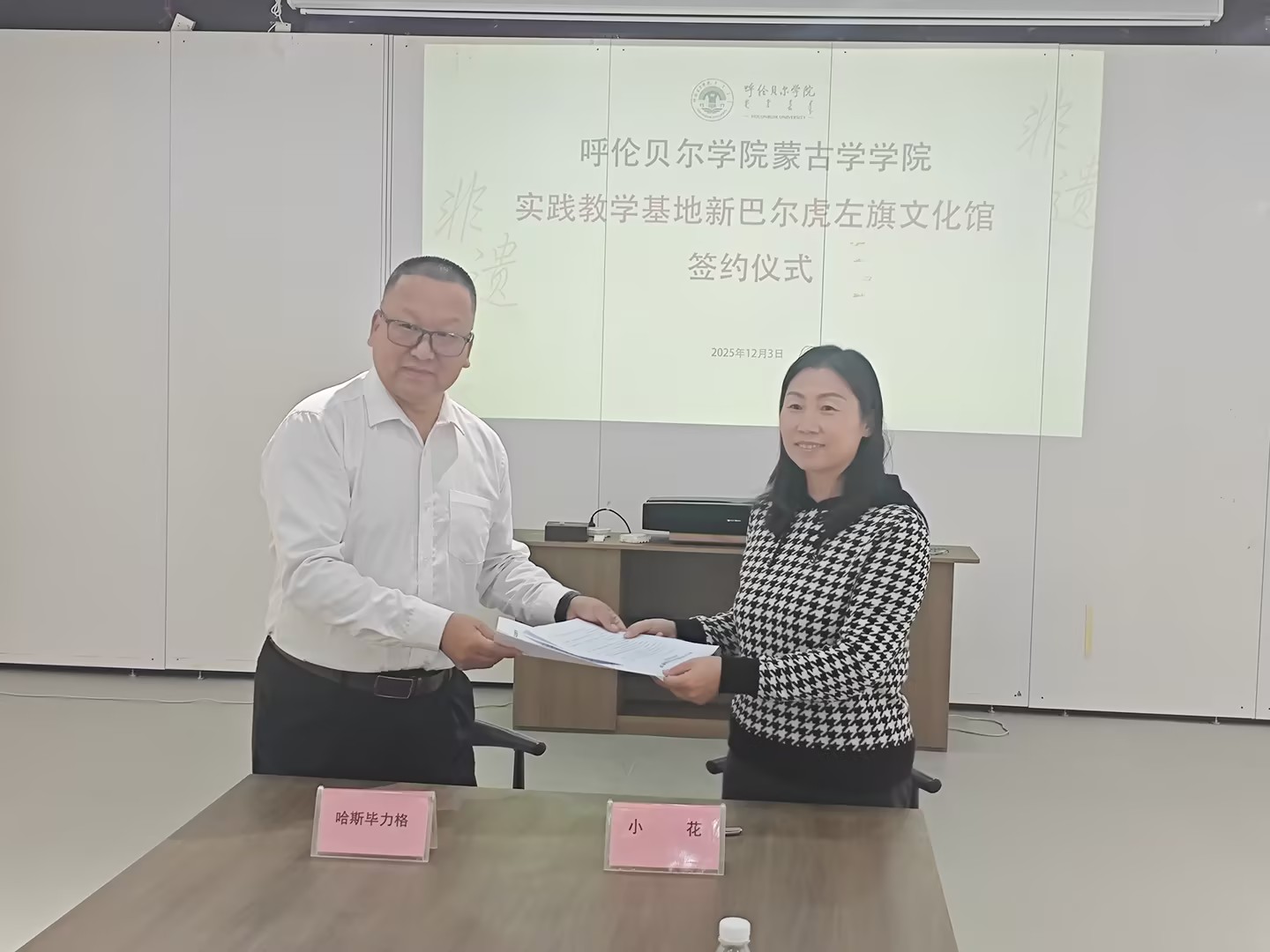 12月3日至4日,蒙古学学院副院长小花带队,系主任青春、教师胡斯乐、斯琴图雅一行四人赴新巴尔虎左旗与新巴尔虎右旗,先后与新巴尔虎左旗文化馆馆长哈斯毕力格、新巴尔虎右旗文化馆馆长灵慧正式签署实践教学合作协议。此次行程以“校地协同、文化传承”为核心,同步完成合作签约与非遗传承人聘请两项重要工作,为实践教学与民族优秀传统文化传承搭建起双向赋能的合作平台。