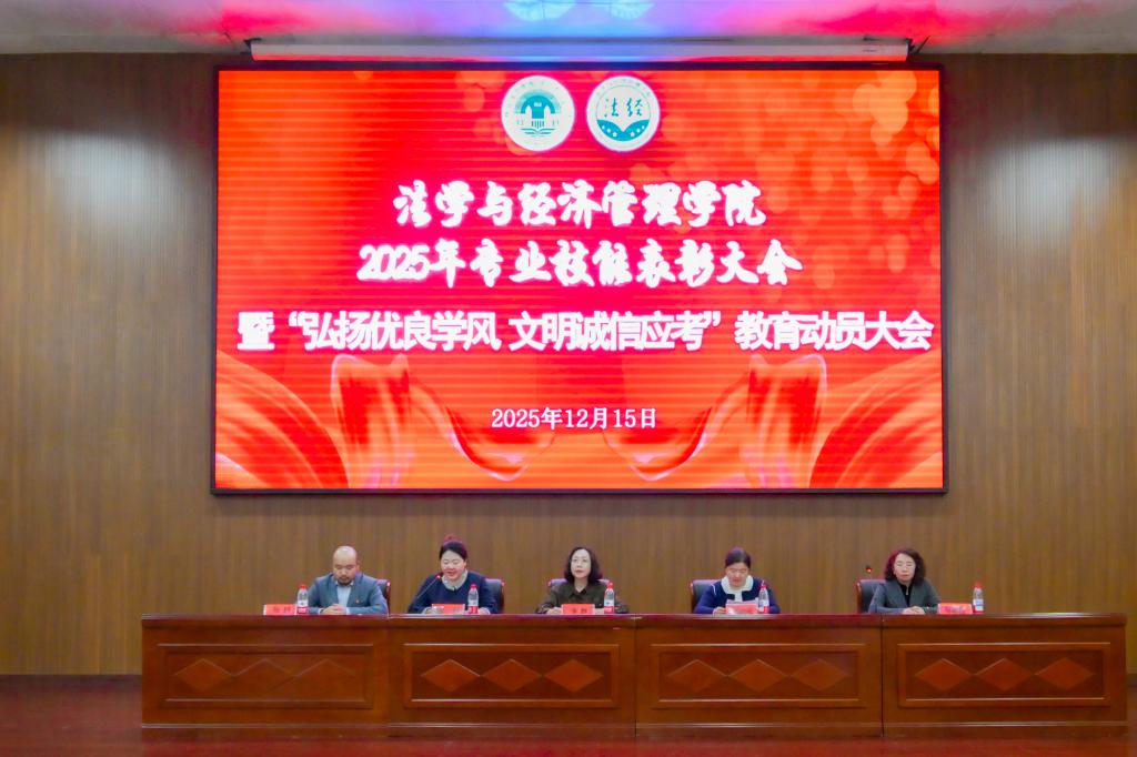为表彰先进、弘扬学风,营造积极向上、诚信守纪的校园文化氛围,12月15日,法学与经济管理学院在图书馆四楼报告厅组织召开2025年专业技能展示月表彰大会暨“弘扬优良学风、文明诚信应考”教育动员大会。大会由学院党委副书记董慧主持,学院领导班子成员、系主任、教师代表及2025级全体学生参加了会议。