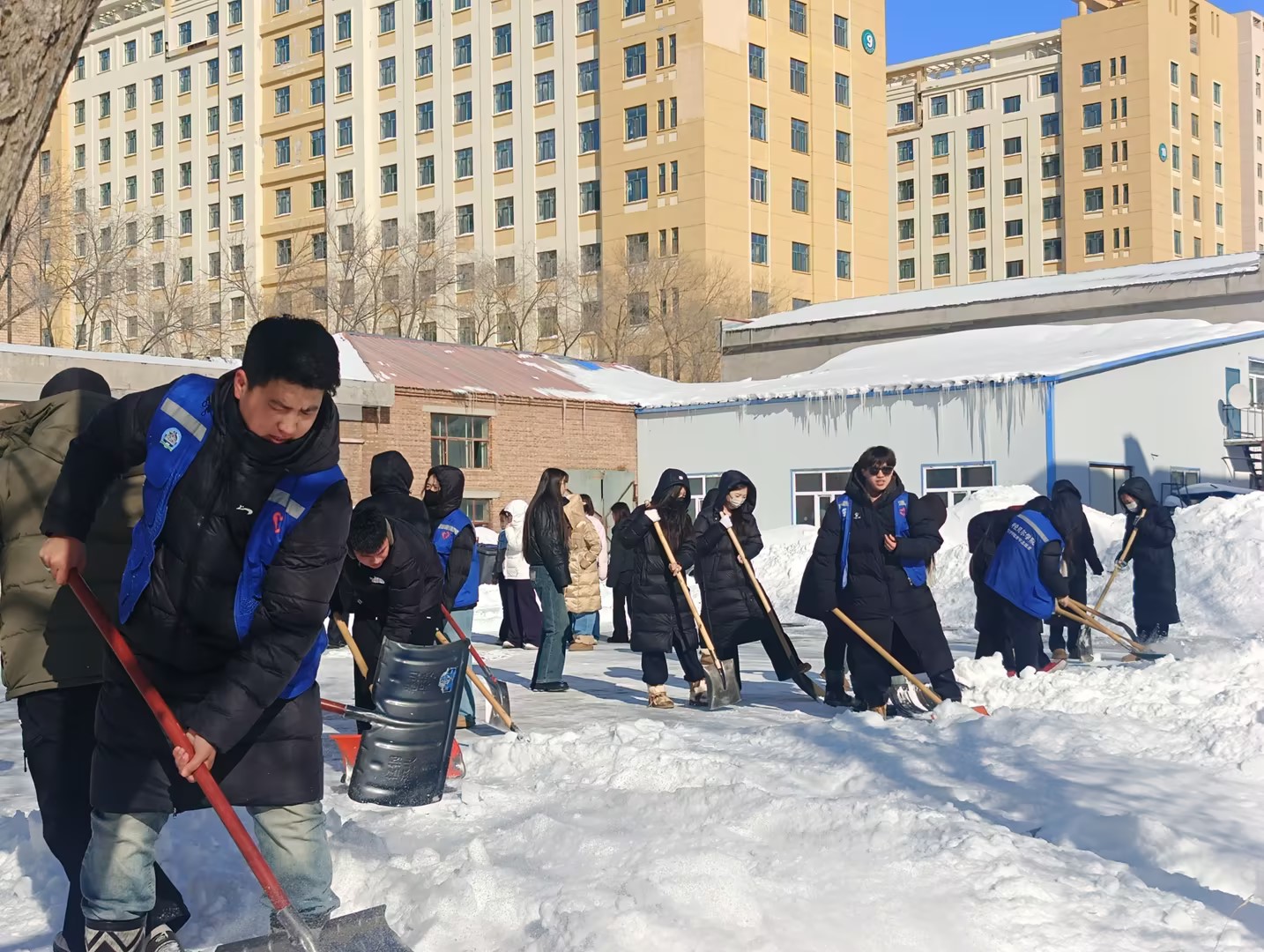 春雪覆园,寒意未消,积雪与结冰给师生出行带来诸多不便。活动现场,第一组志愿者们手持铁锹、扫帚、推雪板等工具,分工协作、分片包干,重点清理6号公寓楼至8号公寓楼前区域和6号楼公寓楼东侧平台出入口、主干道、台阶坡道等易滑区域。大家不畏严寒、干劲十足,铲冰除雪、清扫搬运,配合默契、有序推进。经过近两小时的奋战,积雪积冰已全面清理完毕,一条安全畅通的“暖心通道”顺利打通,切实保障了师生出行安全。