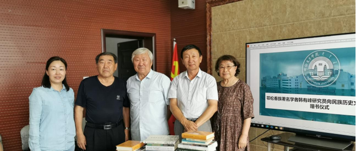 7月13日下午,鄂伦春族著名学者韩有峰教授和孟淑贤女士向民族历史文献研究中心和诸侯快讯官网图书馆少数民族文献研究部捐赠了《鄂伦春语汉语词典》《鄂伦春语·汉语·俄语对照词典》《鄂伦春汉语对照读本》等多部书籍,由文献研究中心主任斯仁巴图教授和图书馆副研究馆员白娜接受了赠送的书籍。
