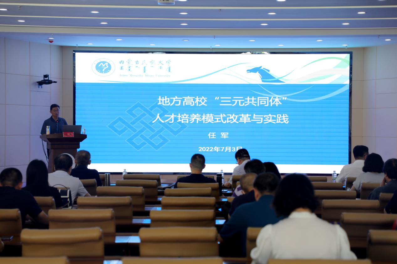 其后,任军副校长做了题为《地方高校‘三元共同体’人才培养模式改革与实践》的人才培养模式改革与实践专题讲座。任校长主要从“三元共同体”价值、“三元共同体”实践和“三元共同体”成效三个方面,结合内蒙古民族大学多年来在教育教学改革、人才培养模式上的探索实践和有益经验等方面进行讲解。