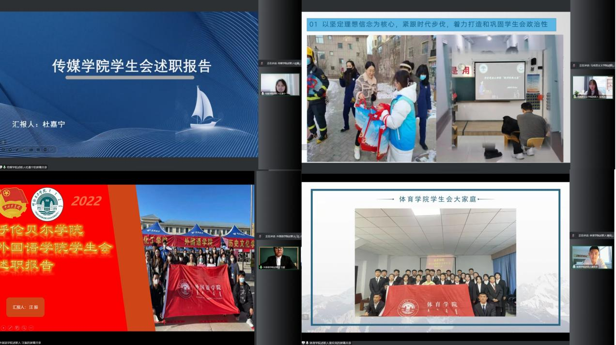 会上,21个学院的学生会主席团成员代表按照抽签顺序依次进行述职汇报,他们利用PPT围绕思想政治态度、道德品行、学习情况、工作成效、纪律作风、下一步工作计划等内容进行了展示。随后,校学生会进行汇报交流。