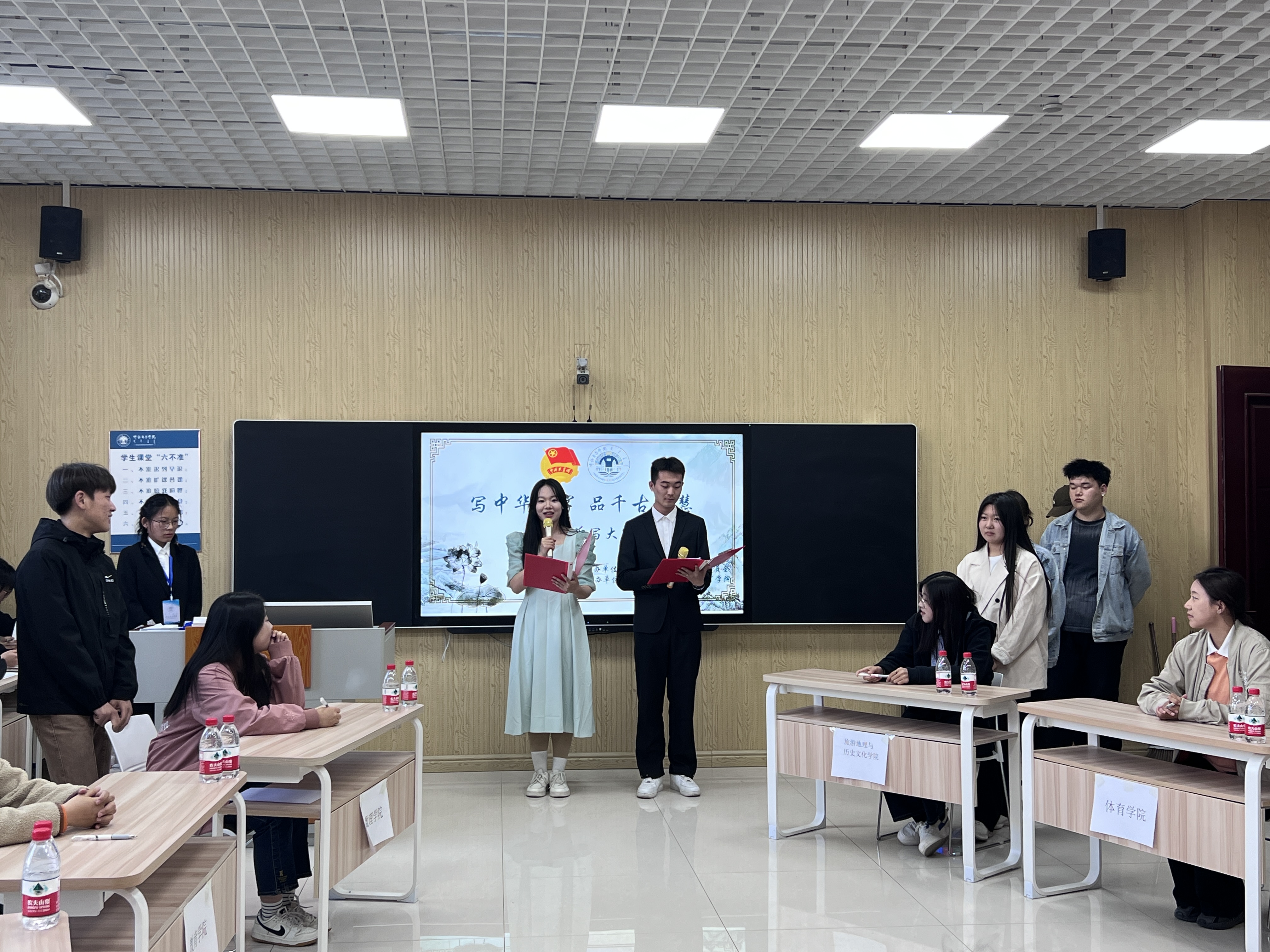比赛内容分为汉字听写、成语听写、金句听写三个部分,每个部分需要参赛学院5个参赛选手依次完成,做答完毕后通过三位评委教师现场打分,确定最终成绩与排名。经过各学院参赛选手激烈角逐,最终,马克思主义学院荣获一等奖,外国语学院、体育学院荣获二等奖,数学与统计学院、教育学院、旅游地理与历史学院荣获三等奖。