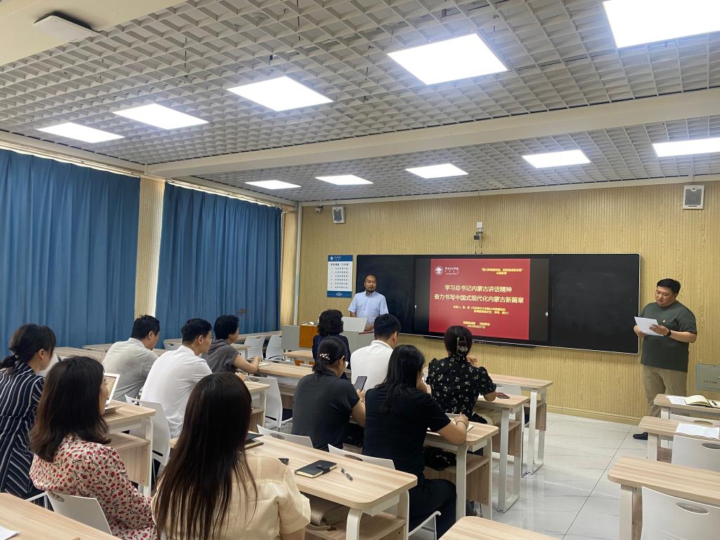 学习会邀请马克思主义学院公共思想政治教育教研部主任张舒作题为《奋力书写中国式现代化内蒙古新篇章》的讲座。他围绕习近平总书记对内蒙古的关怀历程、习近平总书记和党中央为内蒙古量身定制的战略定位、奋力书写中国式现代化的内蒙古新篇章等三方面,用大量事例和图片展现习近平总书记对内蒙古的关怀厚爱和期望重托。