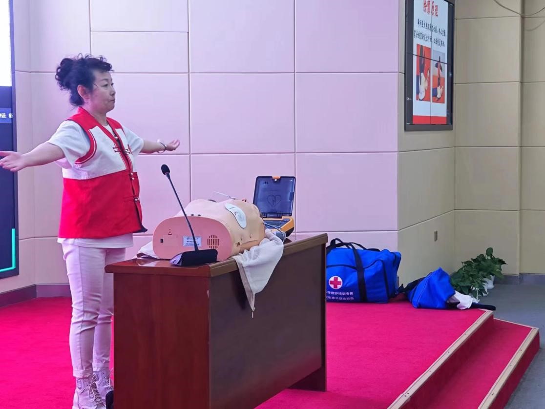 呼伦贝尔市博爱讲师团队长、呼伦贝尔市红十字会应急救护培训中心主任张静凤围绕救护新概念、自动体外除颤器(AED)的使用、CPR心肺复苏术等内容进行了详细的讲解,并在现场进行了实操。在活动现场,学生们在张静凤老师的指导下,依次在模拟人体上进行演练,从判断意识入手,进行了打开气道、清理口腔、人工呼吸、胸外按压等一系列操作,有效提升了大家的实操能力。