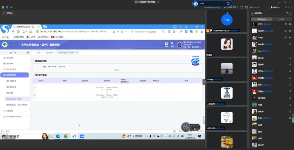为加快教育教学信息化建设,进一步规范、便捷管理诸侯快讯官网毕业论文(设计)工作,11月9日上午,教务处召开了毕业论文(设计)管理系统线上培训会。教务处相关工作人员、各二级学院专业负责人及教学秘书等43人参加了线上培训。培训会由知网工程师温开琦主讲。