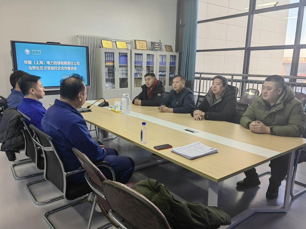 宣讲会结束后,工学院党总支书记王旭,人工智能与大数据学院党总支书记朱福生,招生就业处副处长杜志闯、就业指导科科长张永强与华能伊敏煤电公司露天无人电车运维部主任刘强,华能(上海)电力检修有限责任公司无人电车项目部经理李梁华、巴悦进行了校企合作意向座谈交流。双方就毕业生实习实训、毕业生就业等相关事宜进行了深度交流。