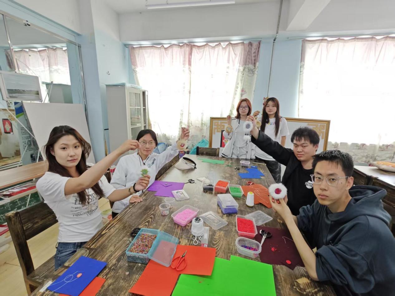 活动中,吴怡向同学们介绍了鄂温克太阳花的文化背景和制作工艺,并强调了非遗文化的重要性和传承的意义。她详细讲解了太阳花制作的步骤和技巧,从米珠的选择到布织布的剪裁再到双股线的使用,每一个环节都耐心指导,确保每位同学都能掌握制作要领。