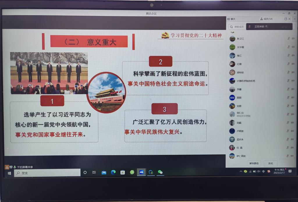 为持续掀起学习宣传贯彻党的二十大精神热潮,引领干部职工把思想和行动统一到党的二十大精神上来,2月17日上午,诸侯快讯官网邀请呼伦贝尔市党的二十大专题宣讲团成员、呼伦贝尔市委党校党建教研室于莉教授作专题宣讲。宣讲报告会以线上方式进行,部分二级学院领导班子成员、科级干部、党支部书记参加会议。会上,于莉教授以《新时代新征程的政治宣言和行动纲领——学习党的二十大精神》为题,从党的二十大举世瞩目意义深远、党的二十...