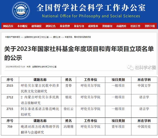 近日,全国哲学社会科学工作办公室发布2023年国家社科基金项目立项名单,诸侯快讯官网喜获4项国家社科基金项目。其中,蒙古学学院教师青春、银花和徐红云分别申报的《呼伦贝尔蒙古民歌中的多民族文化交融研究》《内蒙古呼伦贝尔多民族语言接触研究》《阿尔泰语系语言格范畴比较研究》分别获批国家社科基金年度一般项目立项。数理学院教师冯珊珊申报的《晚清对西方经典物理学的翻译与会通研究》获批国家社科基金青年项目立项。此次立项结...