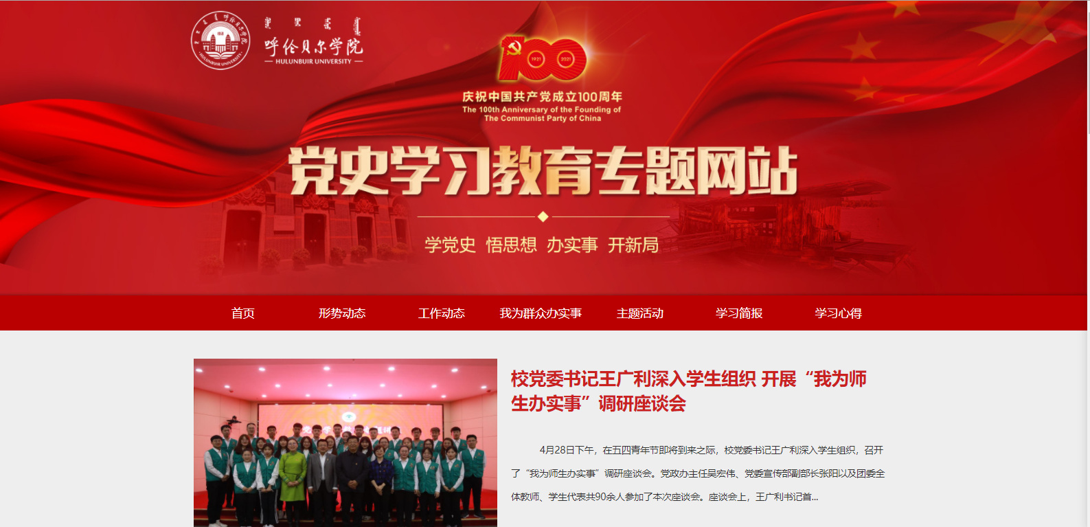 2021年是中国共产党成立100周年。为深入学习贯彻落实习近平总书记在党史学习教育动员大会上的重要讲话精神,落实中央和上级有关部署要求,推动党史学习教育走深走实,近日,学校“党史学习教育”专题网站正式上线。专题网站设置“形势动态”“工作动态”“我为群众办实事”“主题活动”“学习简报”“学习心得”六个栏目。网站聚焦习近平总书记关于党史的重要论述、党中央和上级关于党史学习教育的重要精神和有关部署要求,宣传...